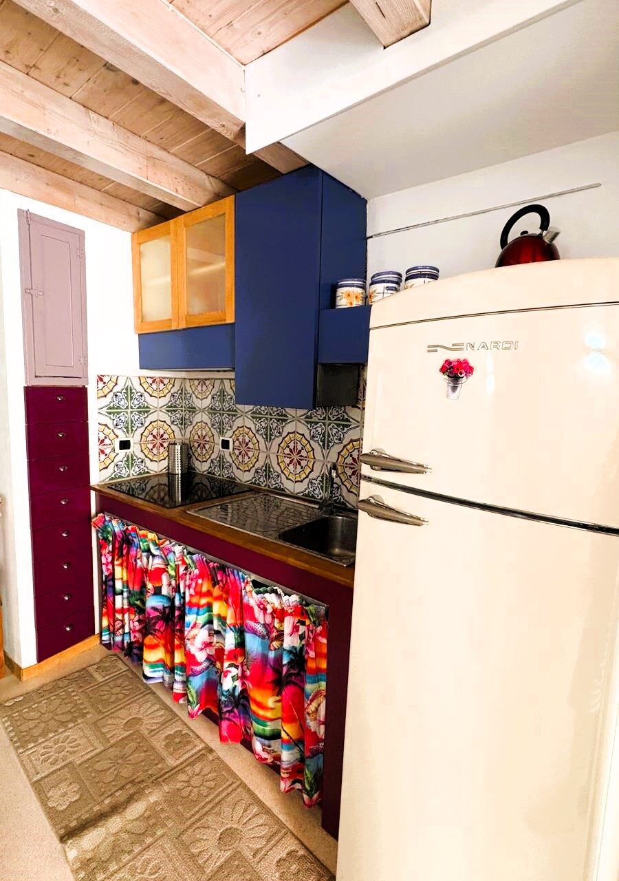 L’ingresso, al primo piano, è accessibile tramite una scala privata e si apre su una luminosa zona living. Qui troviamo un accogliente angolo relax con divano, uno spazio a parete perfettamente organizzato per riporre le biciclette e una cucina con zona pranzo, arricchita da un balcone che si affaccia su Via Dione. Completa il piano un bagno comodo e ben rifinito.