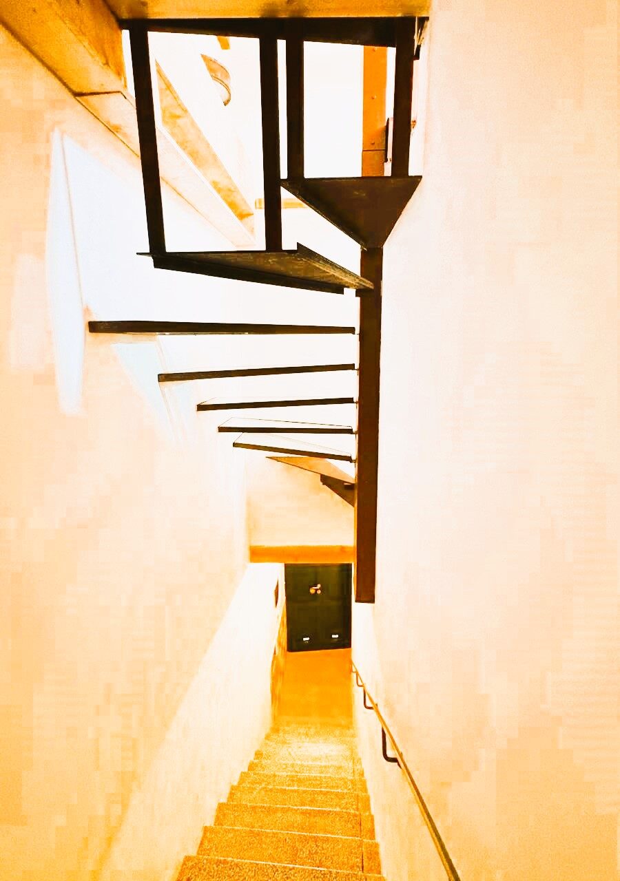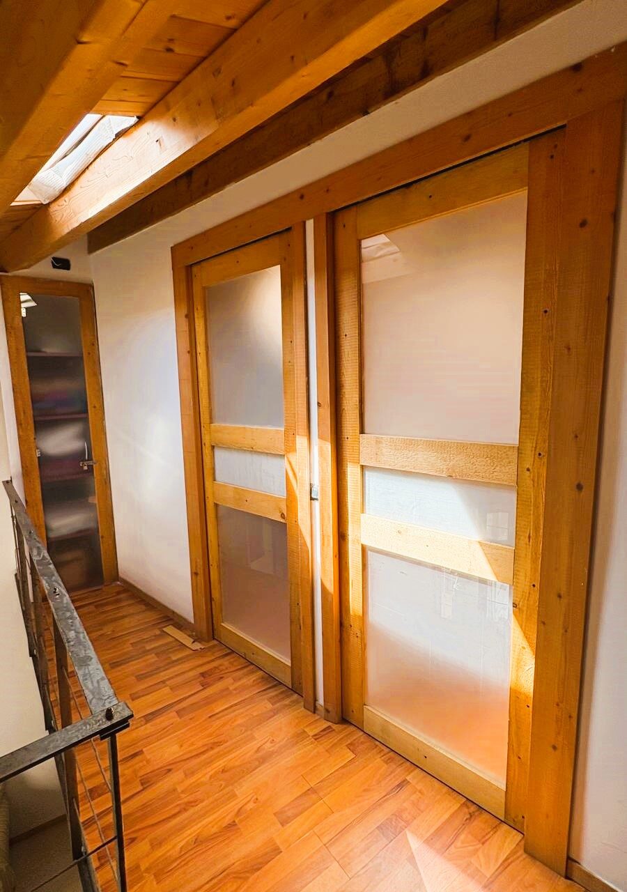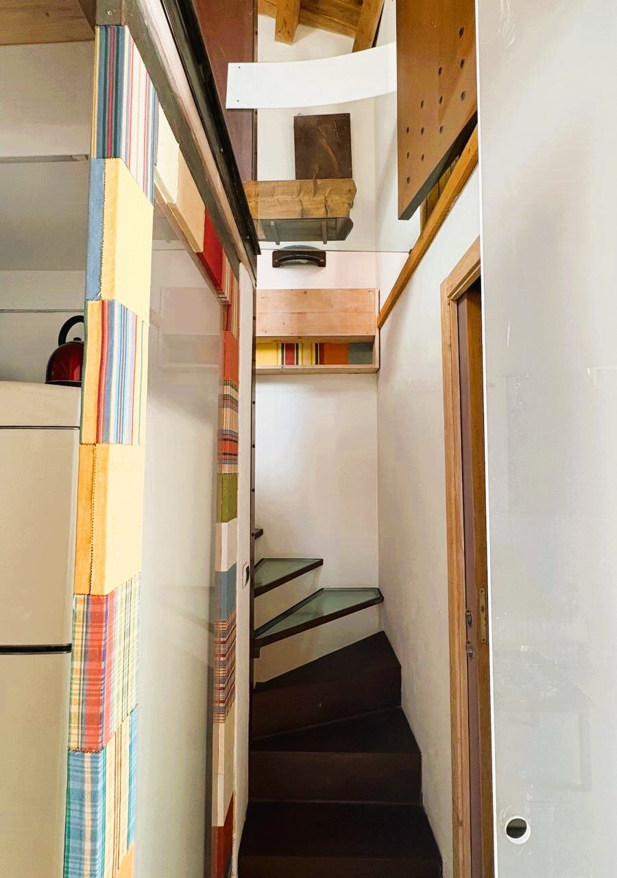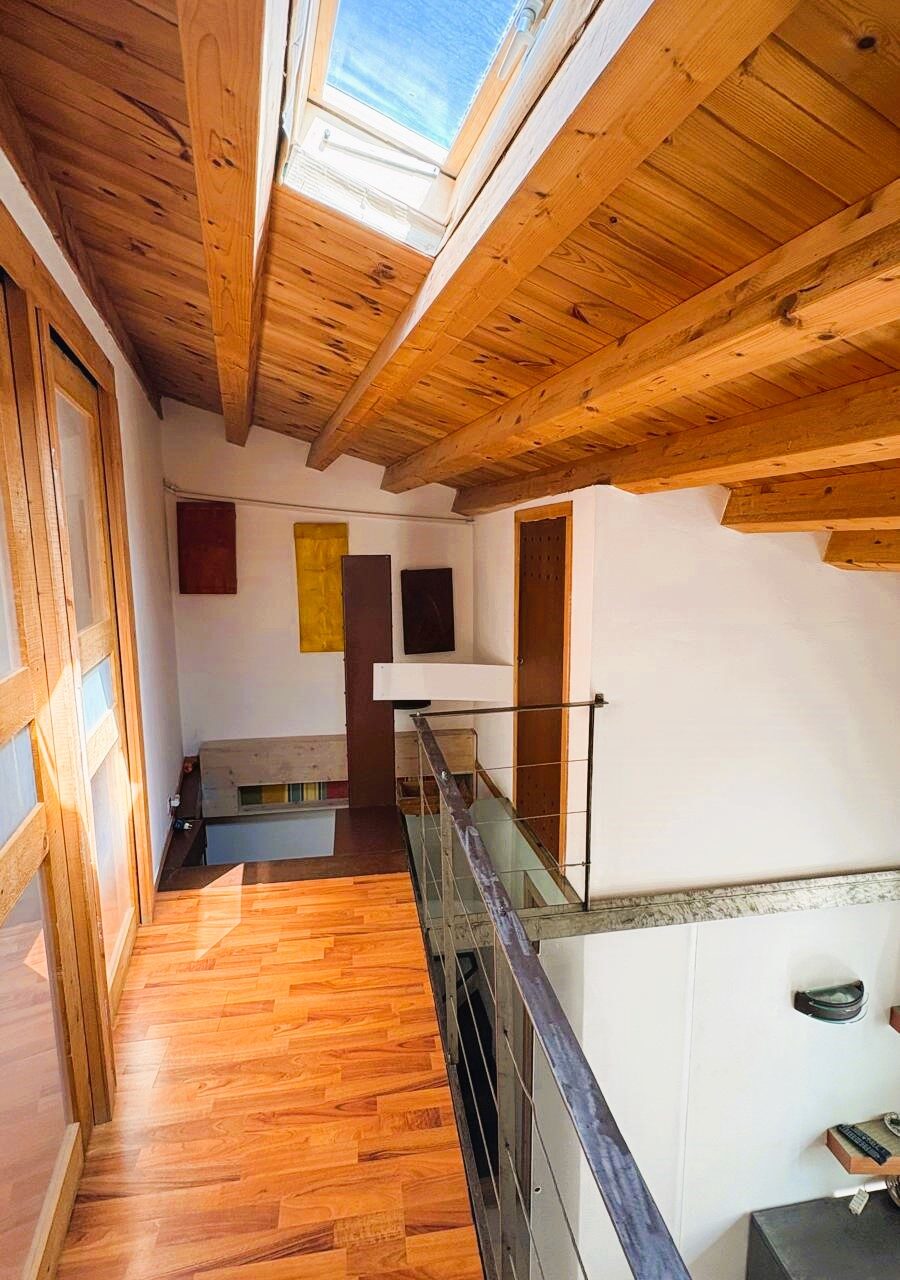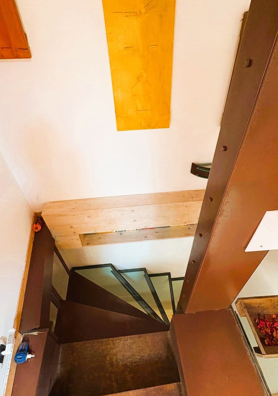 Una scala in ferro e vetro, dal design moderno e leggero, conduce al piano superiore, dove si trovano due spaziose camere da letto matrimoniali e un pratico ripostiglio.
